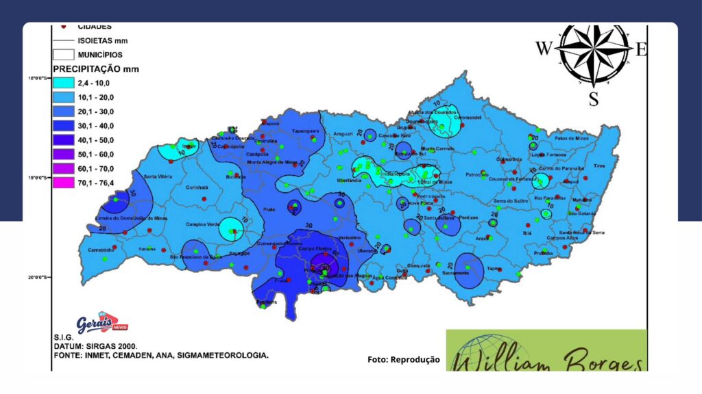 Pirajuba, Campo Florido e Conceição das Alagoas: A região concentrou os maiores volumes. Em Pirajuba, os mais de 70 mm indicaram episódios de chuva intensa, com risco pontual de enxurradas em áreas rurais.
