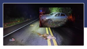 Na madrugada desta quarta-feira (25), por volta das 2h31, a Polícia Militar Rodoviária (PMRv) atendeu a uma ocorrência de atropelamento de animal no km 182 da BR-352, no município de Patos de Minas.