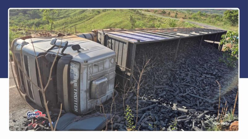 Caminhão carregado com carvão vegetal tomba na MG-188, em Coromandel