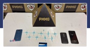 Em continuidade aos trabalhos, foram realizadas buscas no imóvel, onde os militares localizaram e apreenderam substâncias entorpecentes e materiais diretamente relacionados à prática do tráfico de drogas – (17 pinos de cocaína, 03 aparelhos celulares, diversos documentos pessoais e 01 cartão de crédito).