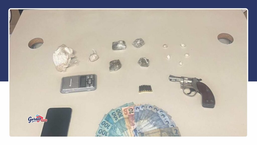 O indivíduo foi alcançado e contido em uma casa vizinha. Durante a ação, os policiais apreenderam uma arma de fogo, munições, porções de entorpecentes e materiais utilizados no tráfico de drogas.