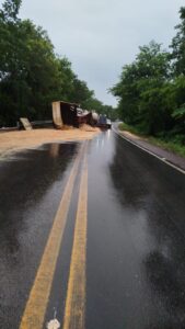 A rodovia encontra-se operando em meia pista devido a grande quantidade de farelo de soja derramado sobre a via, deixando a pista escorregadia. A limpeza do local foi iniciada neste momento. Após a retirada do material, um caminhão-pipa da prefeitura realizará a lavagem da pista.